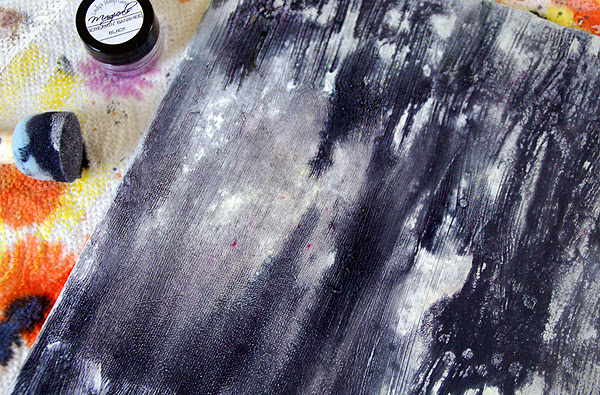After that I dabbed a reasonable big amount of the "Screaming Banshee Black" Magicals powder that i had mixed with water over the slightly damp surface and then mixed the two layers together with a paint brush and let everything dry out properly. This way I got a light grey tone for my background.